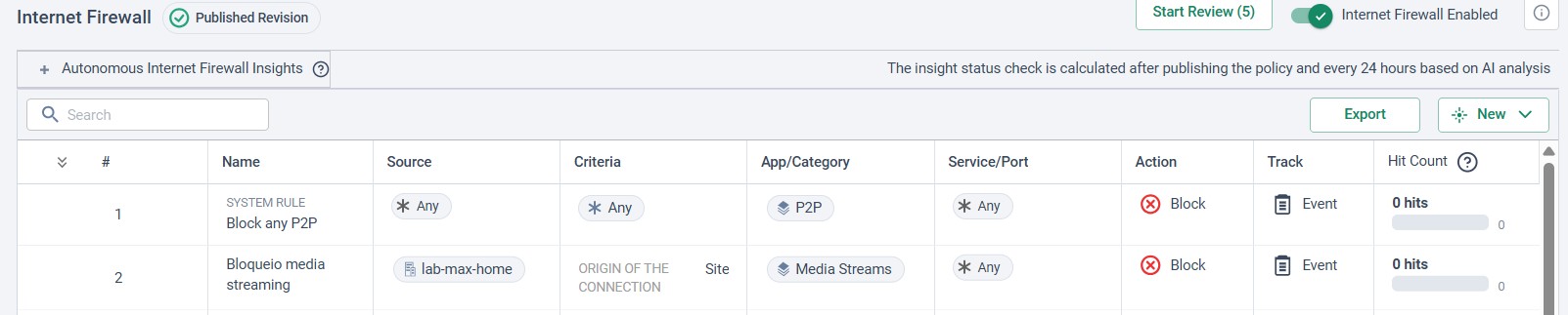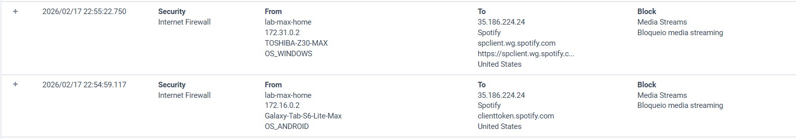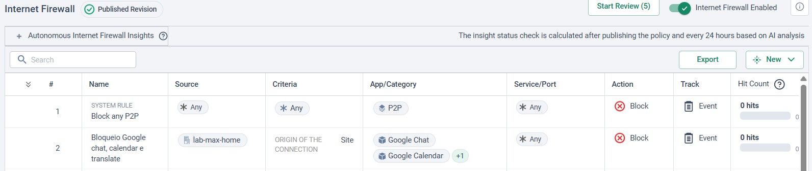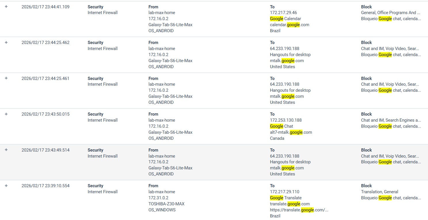 Quando desejamos bloquear toda forma de tráfego a respeito de uma aplicação, a ferramenta a ser usada é o firewall. Diferente de um DLP (Data Loss Prevention) , que foca no controle dos dados, o firewall se concentra na(s) aplicação(ões), podendo ser bastante granular, caso tenha capacidade de analisar a camada 7. Neste projeto, utilizamos o recurso de firewall de uma solução SASE (Secure Access Service Edge), que monitora o tráfego de uma filial, no modo inline, conforme topologia a seguir. Para o 1º caso, foi testado o bloqueio de uma categoria de aplicação chamada Media Stream, que inclui Netflix, Spotify, Youtube, MUBI, Amazon Prime Video, TED, entre outras similares. Como a análise não se baseia pura e simplesmente nos dados trafegados (mas sim no metadado em conjunto com o conteúdo útil), não utilizamos o recurso de TLS Inspection. Ao invés disso, a solução funciona a partir de DPI (Deep Packet Inspection), além da análise de assinatura e cabeçalho. A regra de firewall #2, para este caso, foi configurada conforme a seguir. Tanto aplicativos mobile quanto aplicações web foram bloqueadas com sucesso. No caso do Spotify, verificamos ambos os formatos, bloqueados, gerando seus relativos eventos. Assim como outras aplicações sob tal categoria: No 2º caso, um teste mais granular de bloqueio: o que for relacionado à translate, calendar ou chat, na suíte de aplicações Google, deve ser bloqueado. Por consequência todo o resto é permitido. A regra #2 correlata segue. Os devidos recursos são bloqueados e todo o resto é permitido.
