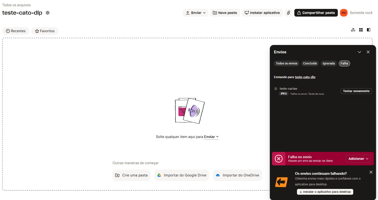Quando tentamos fazer upload via Dropbox, o bloqueio ocorre diretamente na aplicação monitorada e um evento é gerado na console.
