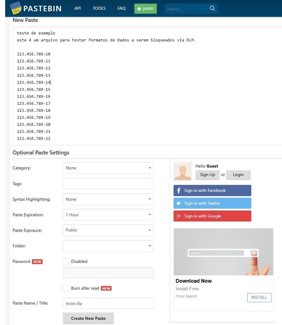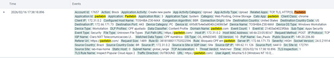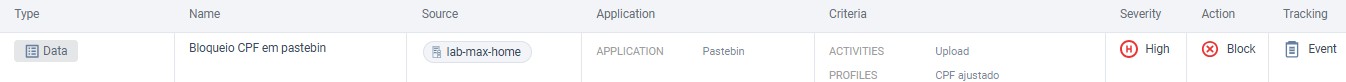 Para o 2º caso, foi testado o vazamento de uma lista de CPFs através de texto  enviado via Pastebin. Como a regra padrão para esse tipo de informação sensível não inclui os diversos formatos possíveis, foi necessário criar, dentro do perfil “CPF ajustado”,  uma REGEX (Regular Expression) para a correta verificação: ^\d{3}\.\d{3}\.\d{3}\-\d{2}$