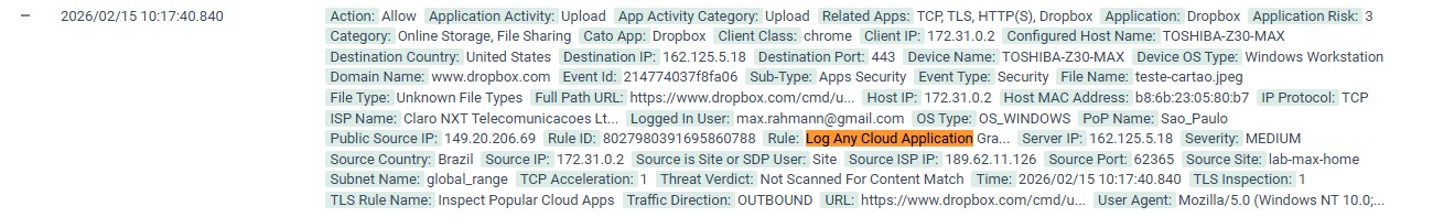 Mas, antes disso, um evento teve foi gerado pela solução para que a solução, para que ela pudesse decriptar o tráfego e analisar seu conteúdo, através de uma regra de TLS Inspection previamente configurada. Isso ocorre porque antes de se avaliar o ato de upload de determinado dado sensível, a própria aplicação teve que ser identificada.