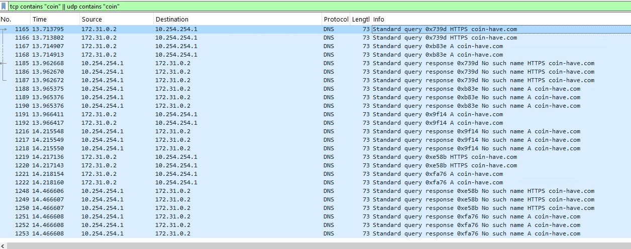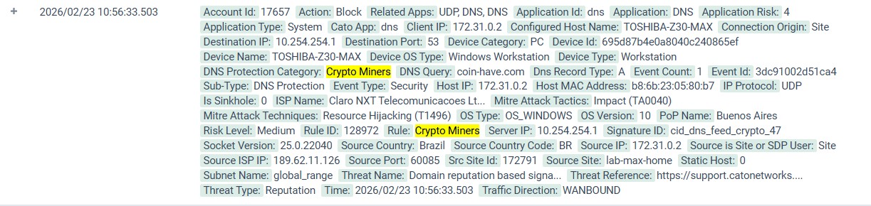 A filtragem de DNS (Domain Name System) apresenta algumas diferenças em comparação com a filtragem de conteúdo web. Para DNS, se analisa o domínio, sendo uma proteção de tempo de resposta relativamente rápido, porém, sem muita precisão, pois o bloqueio ocorre no domínio inteiro, provocando um efeito “tudo ou nada”. Já para conteúdo web, analisamos a URL e, dessa forma, conseguimos ser mais precisos ou granular, pois dentro de um domínio é possível separa serviços em subdomínios ou até pastas, cobrando um tempo de resposta maior, pois geralmente é necessária a inspeção SSL/TLS. Sua utilidade é voltada não só para segurança, mas também produtividade. Neste projeto, utilizamos o recurso de proteção de DNS de uma solução SASE (Secure Access Service Edge), que monitora o tráfego de uma filial, no modo inline, conforme topologia a seguir. Antes de testar a proteção, verificamos como ocorre a sequência de frames a um típico website legítimo: Verificamos que inicialmente o client faz a consulta DNS para o site cookpad, ao IP 10.254.254.1, que é o servidor DNS da solução SASE. Ele será sempre consultado (para fins de DNS), independente do roteador e/ou a placa de rede estarem apontados para outro servidor DNS, público ou privado. Isso ocorre porque a solução SASE atua também como um serviço DNS integrado à sua nuvem, que automaticamente intercepta, inspeciona e resolve consultas DNS, garantindo segurança e acesso aos recursos internos. Posterior a isso, como o site é legítimo, o conteúdo HTTP (HyperText Transfer Protocol) é entregue. Agora vamos ao 1º teste de proteção DNS: Ao tentarmos acessar o site hsdps.cc, o servidor DNS SASE decide não resolver o domínio e devolve uma resposta “no such name” à consulta DNS e uma mensagem “ERR_NAME_NOT_RESOLVED” no navegador. O que aconteceu, neste caso, foi que a nuvem SASE, ao verificar que o domínio em questão está atrelado a uma assinatura conhecida (cis_dns_feed_malware_vt_domain), já efetuou o bloqueio na etapa de consulta de DNS. Tal assinatura, inclusive, reconhece que acesso ao website traria o risco da tática Command & Control, do MITRE Attack. Como a contenção é feita ainda na fase de consulta DNS, o tráfego ocorre apenas entre filial e nuvem SASE, e sua direção é denominada WANBOUND. Por isso, não houve identificação de nenhum frame que não fosse UDP/DNS. Para o 2º caso, foi testado o site foreignabnormality.com, o qual, casou, no mecanismo de proteção de DNS, com a regra “Phishing”. Como a solução está configurada para a ação Sinkhole à tal regra, foi exatamente isso que ocorreu. Ao analisarmos a captura de pacotes, vemos que, a resposta à consulta DNS, dessa vez, aponta para o IP 10.254.254.107, conforme o frame nº 2587. Este IP corresponde justamente ao IP Sinkhole, ou também conhecido como “blackhole”. E este é motivo pelo qual, após o website ser resolvido para tal IP, há uma enorme taxa de retransmissão. Inclusive, no primeiro frame dessa natureza (nº 2611) , é verificada a flag TCP “This frame is a (suspected) retransmission”, comportamento típico de quando realmente o Sinkhole entra em ação. O client tem a expectativa de se conectar ao site real, mas recebe um IP “falso” no seu lugar. O tal IP “falso” é programado para não responder com o conteúdo, ou simplesmente descartar o tráfego, provocando o client a tentar a retransmissão sucessivas vezes. Usamos normalmente Sinkhole para podermos analisar ameaças desconhecidas ou furtivas. Assim se ganha mais visibilidade, expondo o IP interno do client que seria a origem do comprometimento. Mesmo após o casamento da regra de Phishing, ocasionando efeito de Sinkhole, a regra Malicious Domains é ativada, porém gerando uma ação de “Block”. Primeiramente o Sinkhole já provoca o navegador para que informe de um mensagem do tipo “ERR_CONNECTION_TIMED_OUT”. No 3º caso, uma tentativa de acesso ao website coin-have.com, categorizado como mineração de Bitcoin, pela plataforma SASE. Mas, sem esta proteção ativada, o conteúdo é enviado, conforme abaixo. Já com a proteção ativa, o fluxo não passa da etapa de consulta de DNS, com sucessivas transações (0x739d, 0x9f14 …) mal sucedidas. O resultado, no navegador, é informado como “DNS_PROBE_NXDOMAIN”, indicando que o servidor DNS não traduziu o domínio em questão. Um evento é gerado, reconhecendo tal domínio como fonte de ameaça, na tática “Impact” e na técnica “Resource Hijacking”, do Mitre Attack, através da regra “Crypto Miners” e da assinatura cid_dns_feed_crypto_47, originada de feeds de segurança, como IBM X-Force, entre outros.