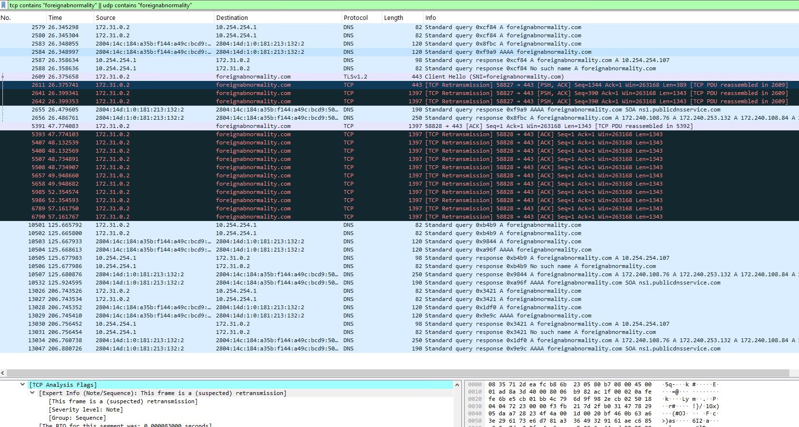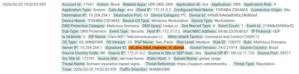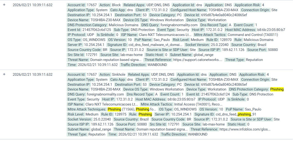 A filtragem de DNS (Domain Name System) apresenta algumas diferenças em comparação com a filtragem de conteúdo web. Para DNS, se analisa o domínio, sendo uma proteção de tempo de resposta relativamente rápido, porém, sem muita precisão, pois o bloqueio ocorre no domínio inteiro, provocando um efeito “tudo ou nada”. Já para conteúdo web, analisamos a URL e, dessa forma, conseguimos ser mais precisos ou granular, pois dentro de um domínio é possível separa serviços em subdomínios ou até pastas, cobrando um tempo de resposta maior, pois geralmente é necessária a inspeção SSL/TLS. Sua utilidade é voltada não só para segurança, mas também produtividade. Neste projeto, utilizamos o recurso de proteção de DNS de uma solução SASE (Secure Access Service Edge), que monitora o tráfego de uma filial, no modo inline, conforme topologia a seguir. Antes de testar a proteção, verificamos como ocorre a sequência de pacotes a um típico website legítimo: Verificamos que inicialmente o client faz a consulta DNS para o site cookpad, ao IP 10.254.254.1, que é o servidor DNS da solução SASE. Ele será sempre consultado (para fins de DNS), independente do roteador e/ou a placa de rede estarem apontados para outro servidor DNS, público ou privado. Isso ocorre porque a solução SASE atua também como um serviço DNS integrado à sua nuvem, que automaticamente intercepta, inspeciona e resolve consultas DNS, garantindo segurança e acesso aos recursos internos. Posterior a isso, como o site é legítimo, o conteúdo HTTP (HyperText Transfer Protocol) é entregue. Agora vamos ao 1º teste de proteção DNS: Ao tentarmos acessar o site hsdps.cc, o servidor DNS SASE decide não resolver o domínio e devolve uma resposta “no such name” à consulta DNS e uma mensagem “ERR_NAME_NOT_RESOLVED” no navegador. O que aconteceu, neste caso, foi que a nuvem SASE, ao verificar que o domínio em questão está atrelado a uma assinatura conhecida (cis_dns_feed_malware_vt_domain), já efetuou o bloqueio na etapa de consulta de DNS. Tal assinatura, inclusive, reconhece que acesso ao website traria o risco da tática Command & Control, do MITRE Attack. Como a contenção é feita ainda na fase de consulta DNS, o tráfego ocorre apenas entre filial e nuvem SASE, e sua direção é denominada WANBOUND. Por isso, não houve identificação de nenhum pacote diferente de UDP/DNS. Para o 2º caso, foi testado o site foreignabnormality.com, o qual, casou, no mecanismo de proteção de DNS, com a regra “Phishing”. Como a solução está configurada para a ação Sinkhole à tal regra, foi exatamente isso que ocorreu. Ao analisarmos a captura de pacotes, vemos que, a resposta à consulta DNS, dessa vez, aponta para o IP 10.254.254.107, conforme o pacote nº 2587. Este IP corresponde justamente ao IP Sinkhole, ou também conhecido como “blackhole”. E este é motivo pelo qual, após o website ser resolvido para tal IP, há uma enorme taxa de retransmissão. Inclusive, no primeiro pacote dessa natureza (nº 2611) , é verificada a flag TCP “This frame is a (suspected) retransmission”, comportamento típico de quando realmente o Sinkhole entra em ação. O client tem a expectativa de se conectar ao site real, mas recebe um IP “falso” no seu lugar. O tal IP “falso” é programado para não responder com o conteúdo, ou simplesmente descartar o tráfego, provocando o client a tentar a retransmissão sucessivas vezes. Usamos normalmente Sinkhole para podermos analisar ameaças desconhecidas ou furtivas. Assim se ganha mais visibilidade, expondo o IP interno do client que seria a origem do comprometimento. Mesmo após o casamento da regra de Phishing, ocasionando efeito de Sinkhole, a regra Malicious Domains é ativada, porém gerando uma ação de “Block”. Primeiramente o Sinkhole já provoca o navegador para que informe de um mensagem do tipo “ERR_CONNECTION_TIMED_OUT”.